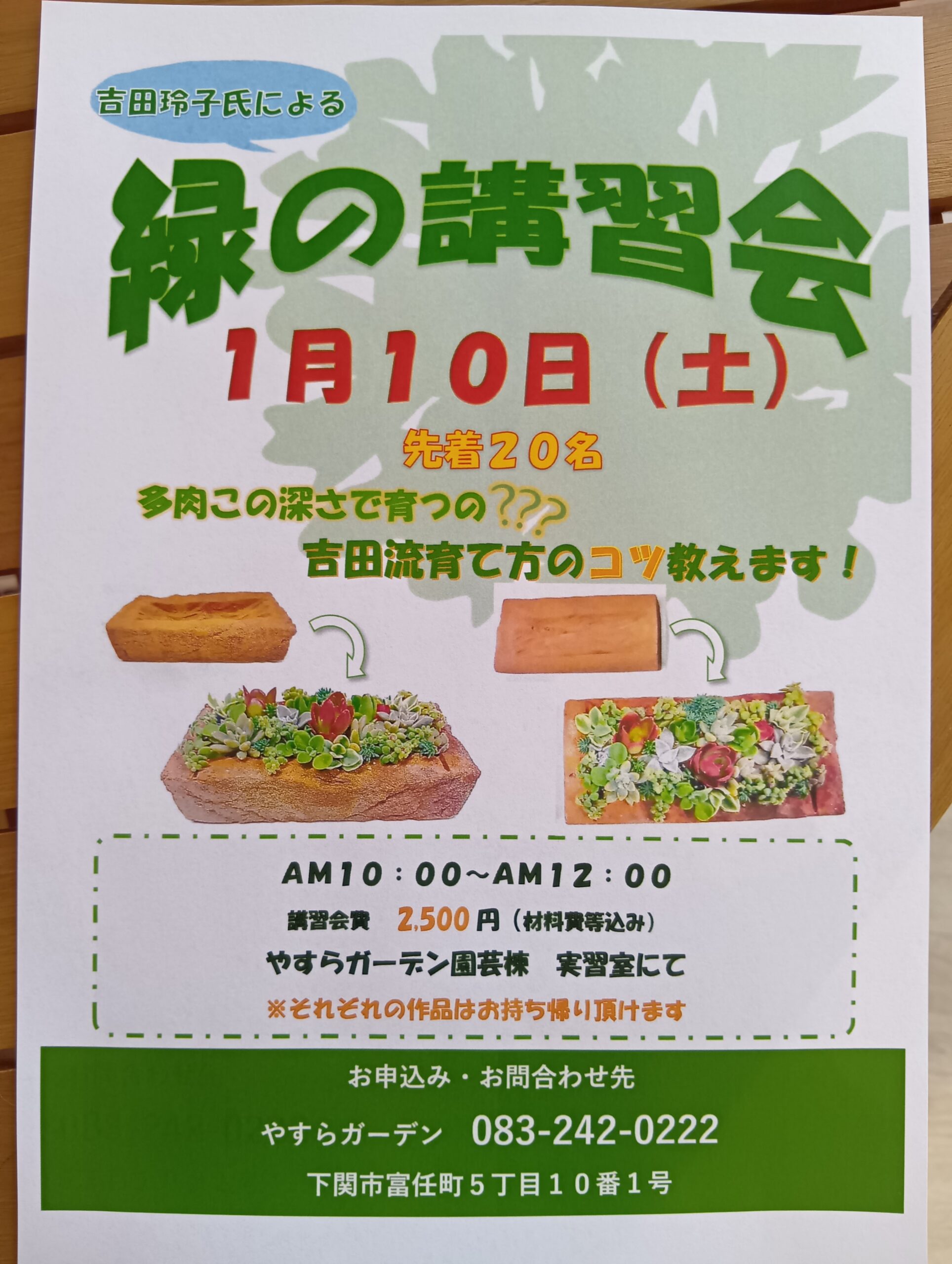 2025/11/20 イベント 緑の講習会 1月10日(土)~先着20名~【開催日時】1月10日(土)10:00~12:00【講 師】吉田 玲子【施 設】園芸棟 実習室【講習会費】2,500円(材料費等込み)多肉この深さで育つの??吉田流育て方のコツ教えます!※それぞれの作品はお持ち帰りいただけます。(お申込み・お問合せ先) やすらガーデン総合受付 083-242-0222古い記事へ一覧新しい記事へ