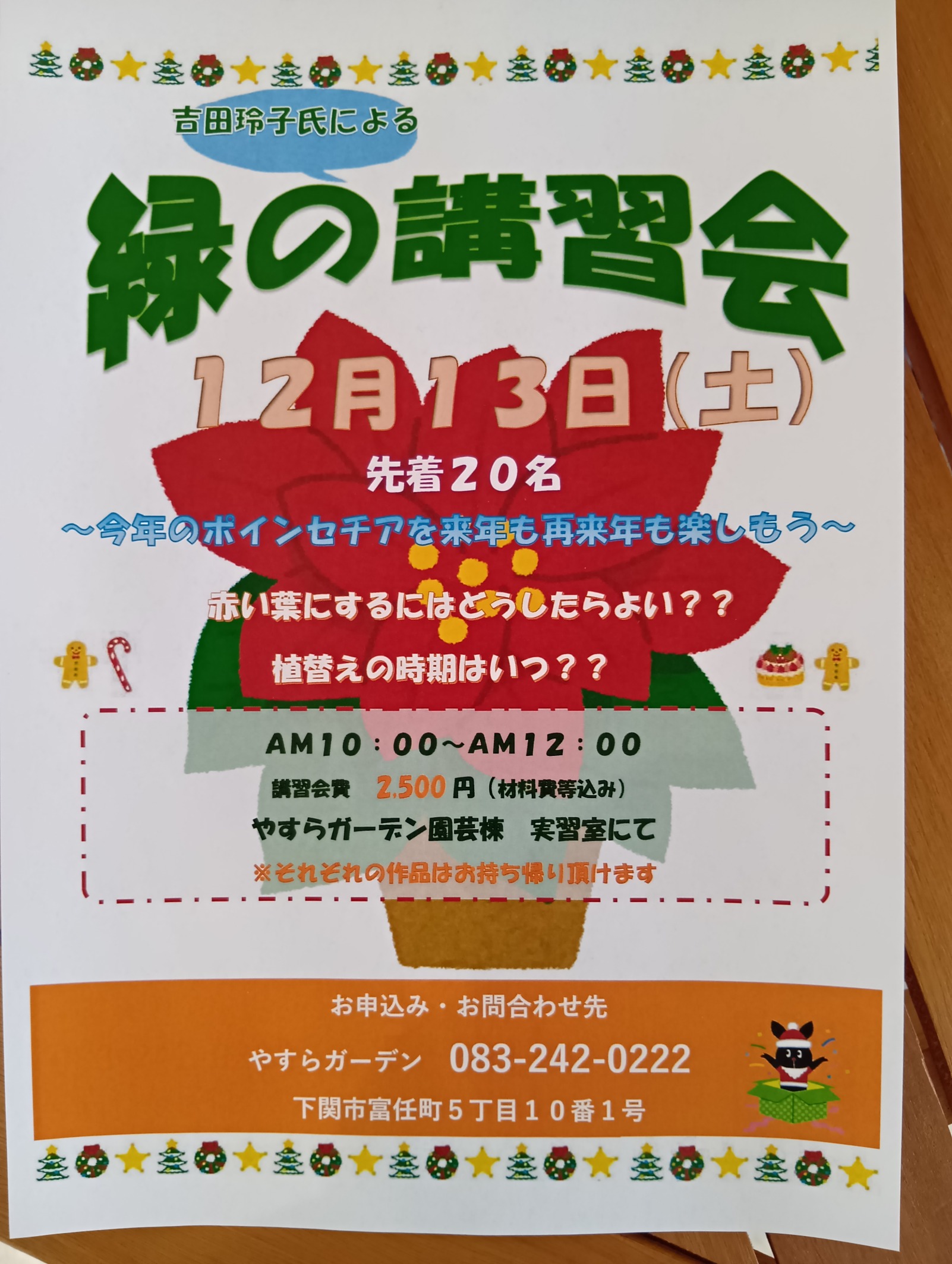 2025/10/16 イベント 緑の講習会 11月8日(土)※定員に達しました。【開催日時】11月8日(土)10:00~12:00【講 師】吉田 玲子【施 設】園芸棟 実習室【講習会費】2,500円(材料費等込み)多肉植物を使ってかわいいリースを作ろう!使用するツル飾りは用意してあります。※それぞれの作品はお持ち帰りいただけます。(お問合せ先) やすらガーデン総合受付 083-242-0222 古い記事へ一覧新しい記事へ