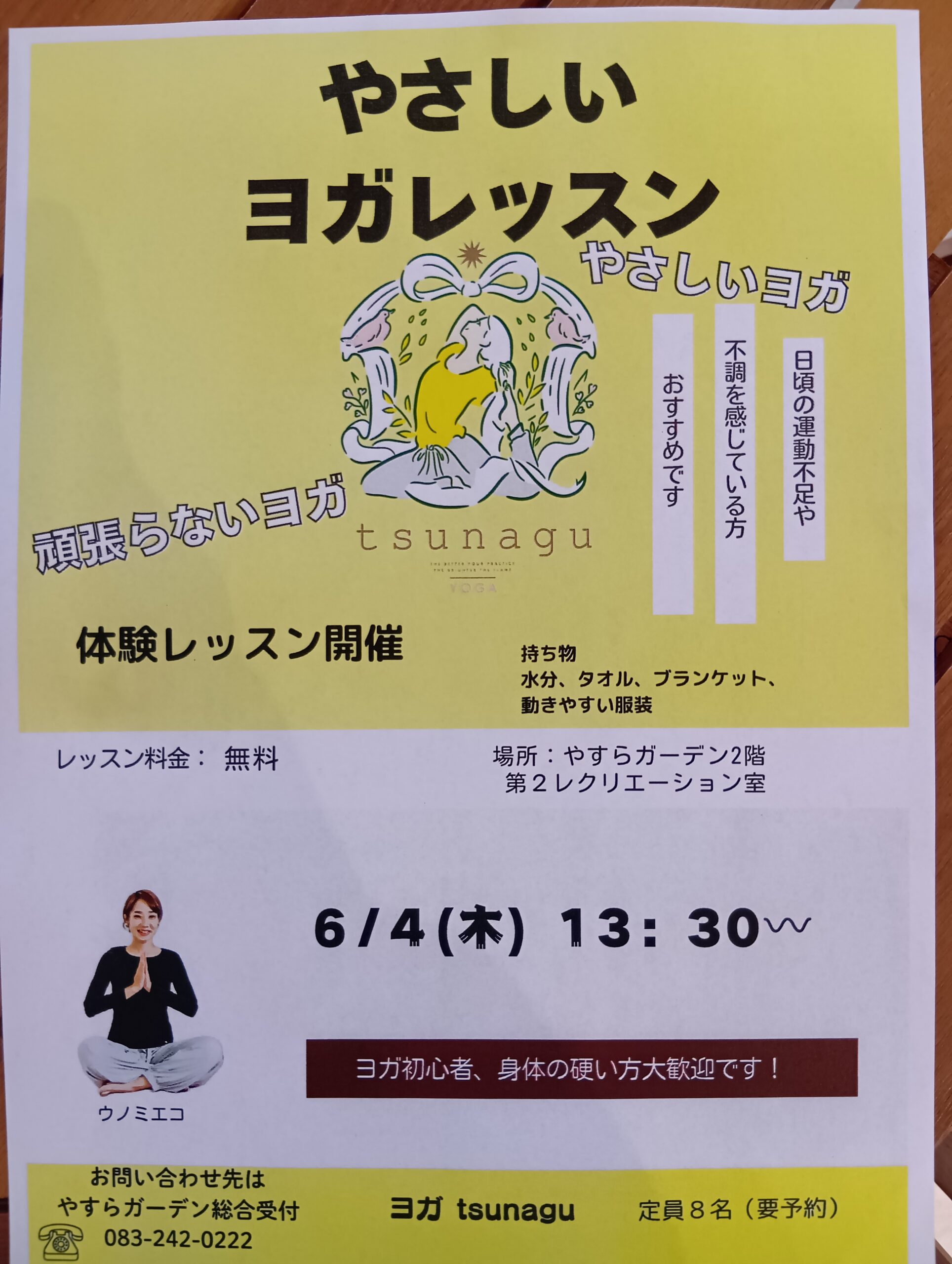 2026/3/16 イベント <参加無料>やさしいヨガレッスンレッスン料金:無料【開催日】6月4日(木)13時30分~ 【場 所】やすらガーデン2階 第2レクリエーション室 【講 師】ウエノ ミチコ ・頑張らばいヨガ ・自分のペースで動いて、心と身体をやわらかくしていくヨガです。(お問合せ先) やすらガーデン総合受付 083-242-0222260316083110058古い記事へ一覧
